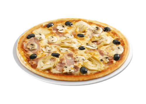 Tomate, fromage, champignons, jambon, poivrons, artichauts, olives