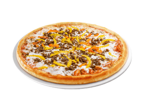Tomate, fromage, viande hachée, merguez, pepperoni, poivrons