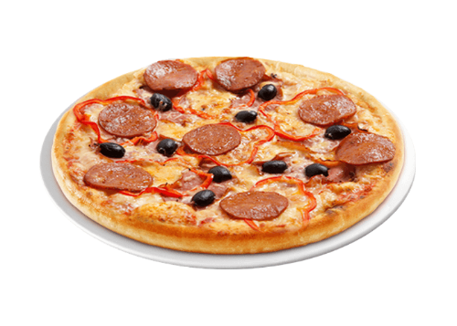 Tomate, fromage, merguez, poivrons, olives, oignons