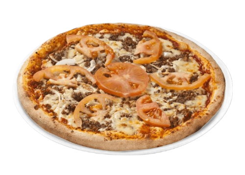 Tomate, fromage, viande hachée, oignons, pepperoni, artichauts