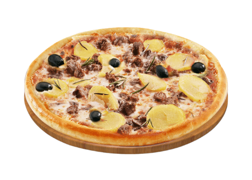 Tomate, fromage, pommes de terre, viande hachée, merguez, olives